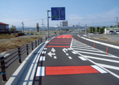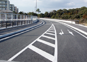 計画によって決められたとおりに、路面に作図をおこないます。現地の状況にあわせて、一番わかりやすいように微調整をするため、熟練した妓術が必要です。